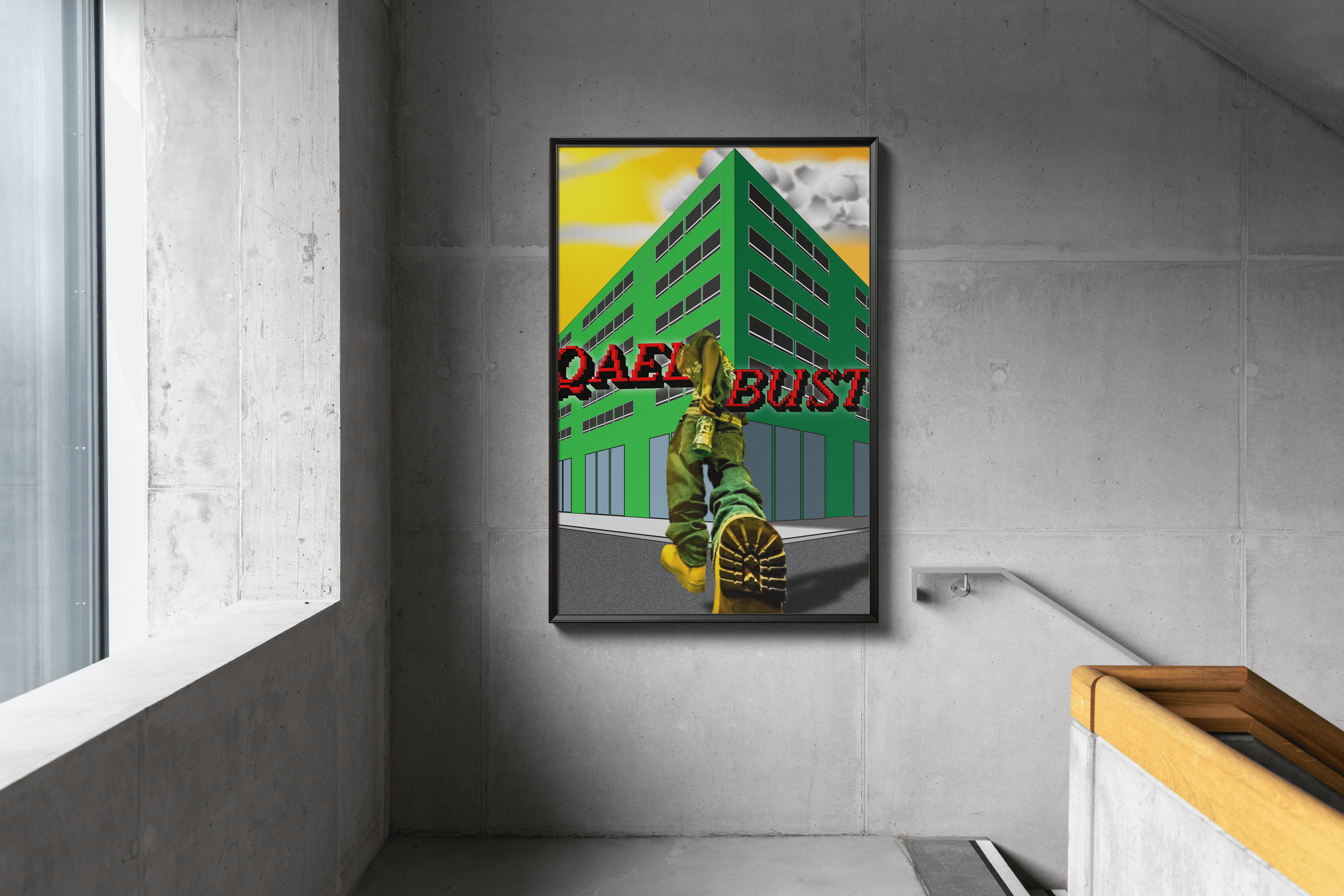 This poster began as a visual exploration rather than a predefined message. The image is constructed to resemble a video game portal embedded into the city, creating the illusion of an exit that feels urgent, surreal, and slightly unreal. The word “QEAL” is intentionally meaningless. Like the portal itself, it does not explain or resolve anything. It exists as a signal rather than a statement, echoing the logic of game environments where symbols guide movement without requiring clarity or justification. “BUST” introduces narrative tension. The figure appears to be escaping, implying pursuit and pressure rather than progress. The run is instinctive, not heroic — a reaction to an unseen threat rather than a destination with purpose. The contrast between the clean, exaggerated architecture and the human body reinforces this sense of artificial space. The poster plays with scale, distortion, and familiarity to blur the line between reality and simulation, treating the city as a playable environment rather than a neutral backdrop.